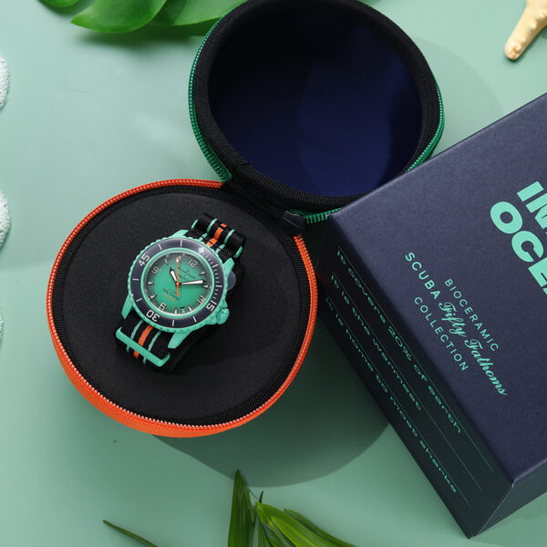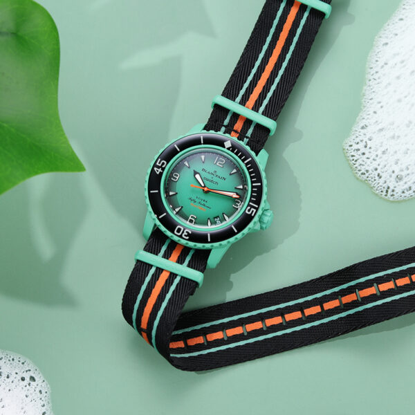 This Blancpain X Swatch watch honors Blancpain’s Fifty Fathoms, the first true diver’s watch. Its green case and crown are made of Bioceramic material. The word “Swatch” is inscribed on the outer left side of the case. The metal dial is printed in several layers of color for a gradient effect. The hour indexes, hour, and minute hands, as well as the scale on the bezel, are enriched with Grade A Super-LumiNova® for outstanding legibility in the dark. The watch features a green unidirectional Bioceramic bezel and biosourced glass. The SISTEM51 mechanical movement is visible thanks to a transparent sapphire glass and features an illustration of the Indian Ocean and the Nembrotha Kubaryana nudibranch in digital print. Five inspirational inscriptions can be found on the back of the watch: PASSION FOR DIVING – LICENCE TO EXPLORE – OCEAN BREATH – PROTECT WHAT YOU LOVE and IMMERSE YOURSELF. The NATO strap is made of recycled fishing nets that were removed from the sea. The pin buckle and loops are made of Bioceramic material.