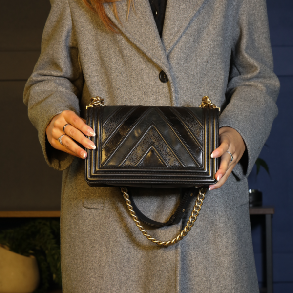 Bold, structured, and instantly recognisable — the Chanel Boy Flap 25 in black chevron leather with gold-tone hardware is one of Chanel’s most iconic and sought-after designs.