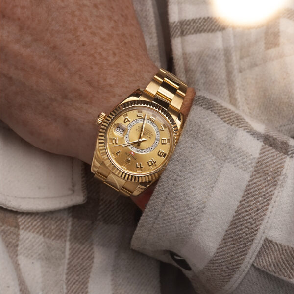 With an RRP over £45,000, the Sky-Dweller in full gold is a modern Rolex masterpiece — combining mechanical brilliance with commanding wrist presence.