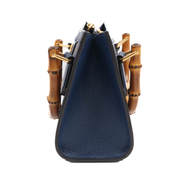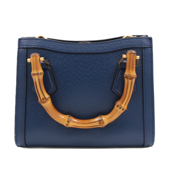 Crafted from smooth navy blue leather, this standout piece features Gucci’s signature bamboo top handles, complemented by a detachable shoulder strap for 2-way styling — handheld or crossbody. Inspired by the original Diana bag and reimagined for modern style lovers, it offers everyday practicality wrapped in high-fashion charm.