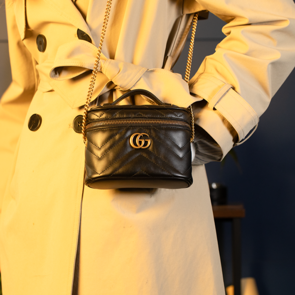 Crafted from smooth black leather, this compact yet statement-making bag features the iconic antique gold-toned GG hardware, a structured top handle, and a detachable chain shoulder strap for versatile styling. Whether carried by hand or worn crossbody, it adds instant polish to any look.