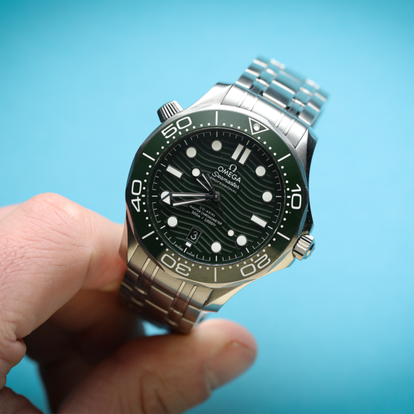 This 2023 full set includes the original Omega box, warranty cards, manual, and tags, and is in excellent condition. With its deep green wave dial, ceramic bezel, and 42mm stainless steel case, this Seamaster is both a serious dive watch and a standout daily wear.