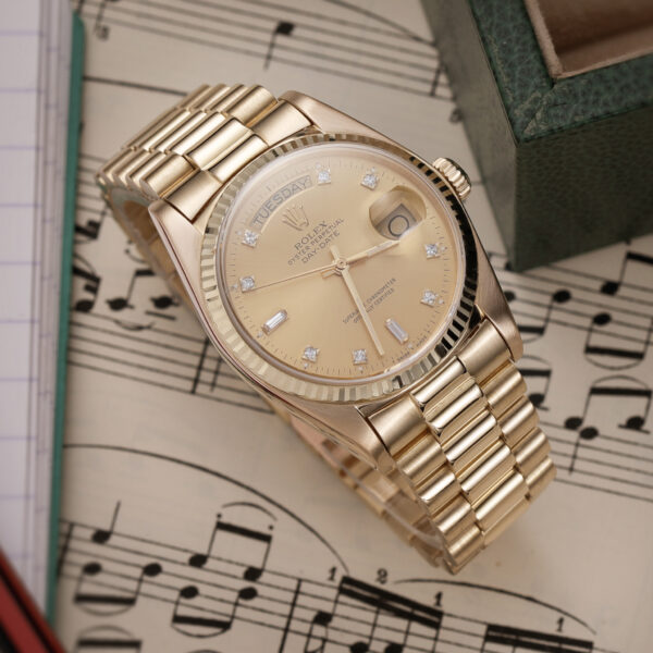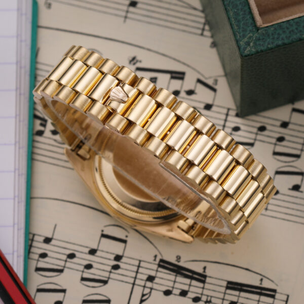 The reference 18038 is the first Day-Date to feature a quickset date function, combining vintage charm with improved usability — making it a favorite among collectors and modern wearers alike.