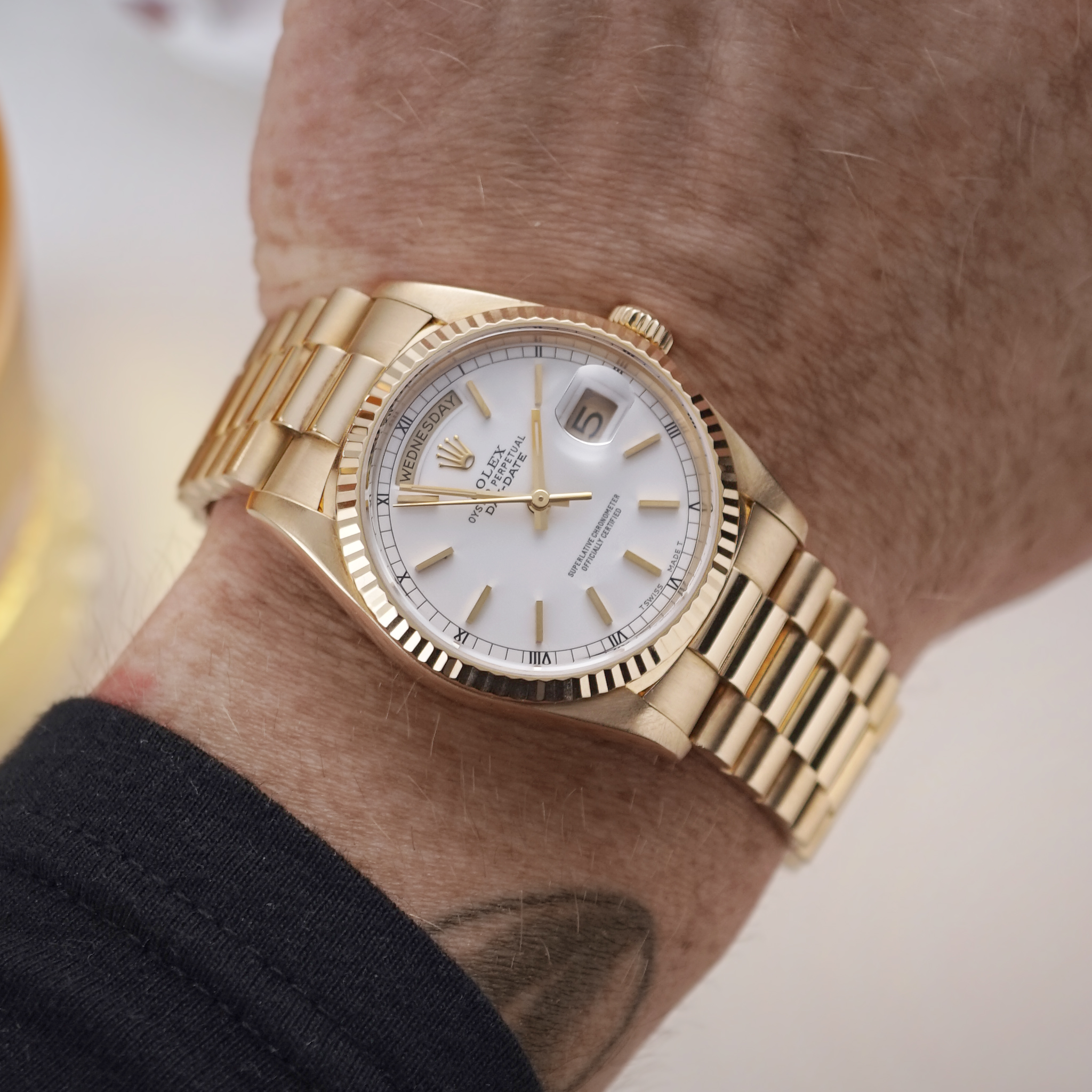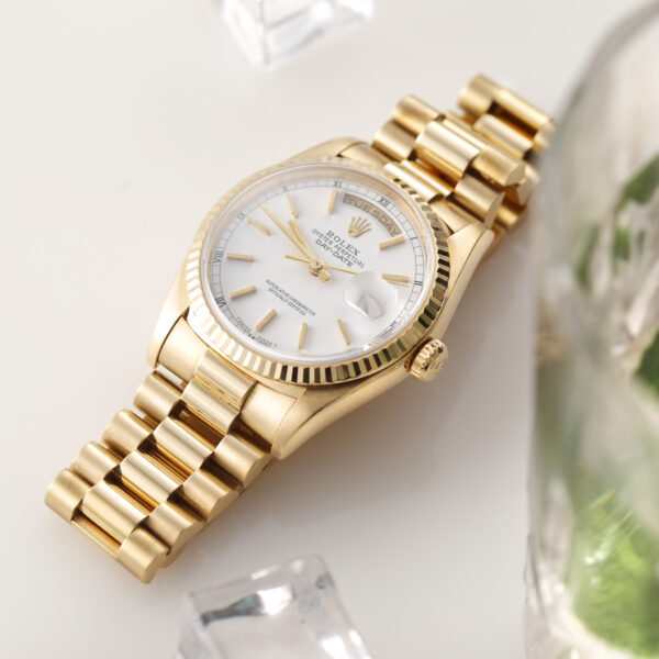 Crafted from solid 18k yellow gold, this classic Day-Date features a clean and timeless white dial with baton hour markers, a fluted bezel, and the signature President bracelet with concealed clasp. As the first watch to display both the day and date in full, the Day-Date is a symbol of status and achievement.