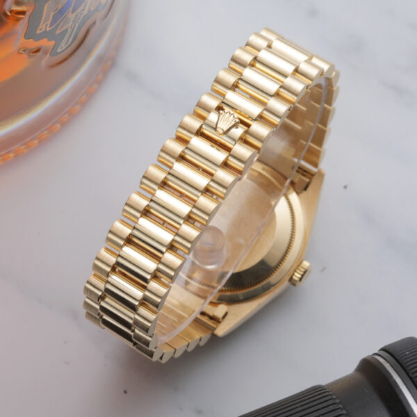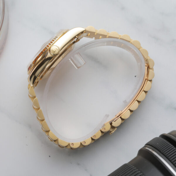 Crafted entirely from solid 18k yellow gold, this legendary 36mm Day-Date features a fluted bezel, President bracelet with concealed Crownclasp, and the elegant white lacquered dial with traditional applied Roman numerals — a combination that exudes understated power and refinement.