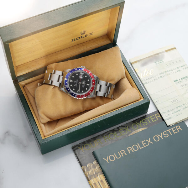This incredibly sought after GMT model from Rolex features the signature blue and red rotating bezel, a black dial with white luminescent hour markers, automatic movement, sapphire crystal glass, a 40mm stainless steel case and is set on a stainless steel Oyster bracelet. This collectible timepiece comes complete with Rolex box and Rolex authenticity papers