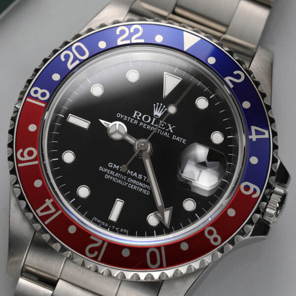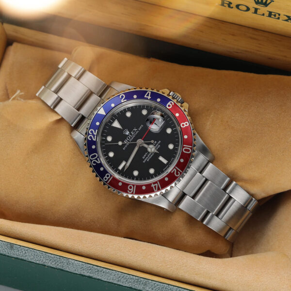 This highly sought-after GMT model features the signature blue and red rotating bezel, paired with a black dial, white luminescent hour markers, and Rolex’s reliable automatic movement. Crafted from 904L stainless steel, the 40mm case is fitted with a durable sapphire crystal and secured on a classic Oyster bracelet — making it as functional as it is iconic.
