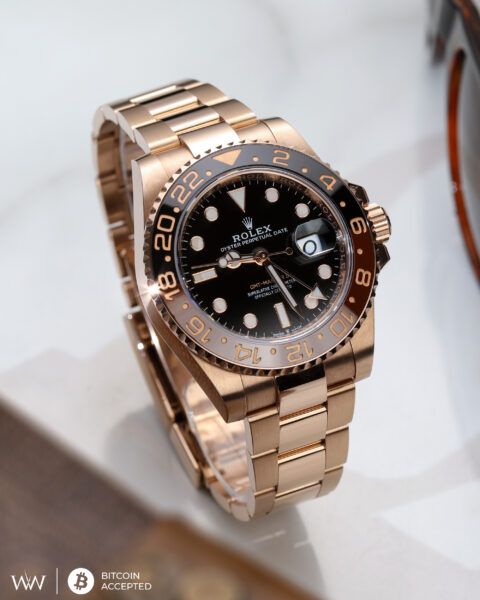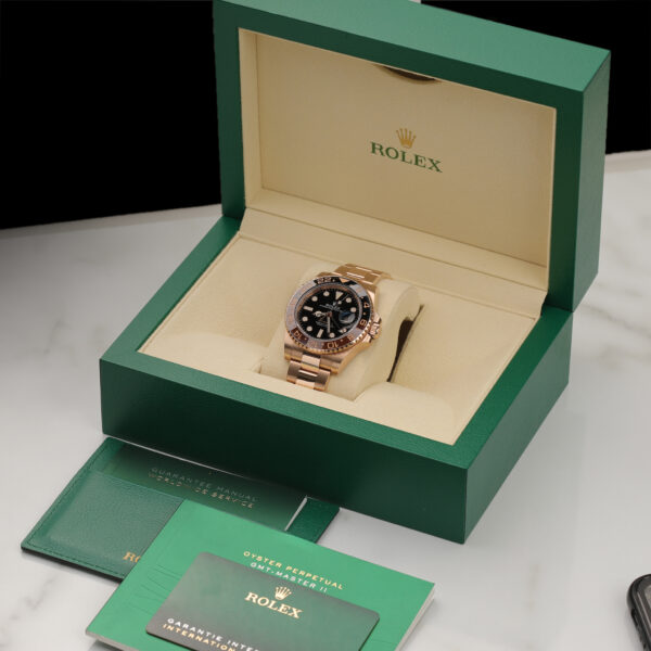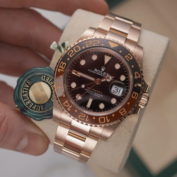 Crafted in 18ct Everose gold, this stunning timepiece pairs luxury with serious travel-ready functionality. The signature black and brown Cerachrom ceramic bezel, matched with the rich black dial and Everose details, creates a bold, contemporary twist on the classic Root Beer aesthetic.