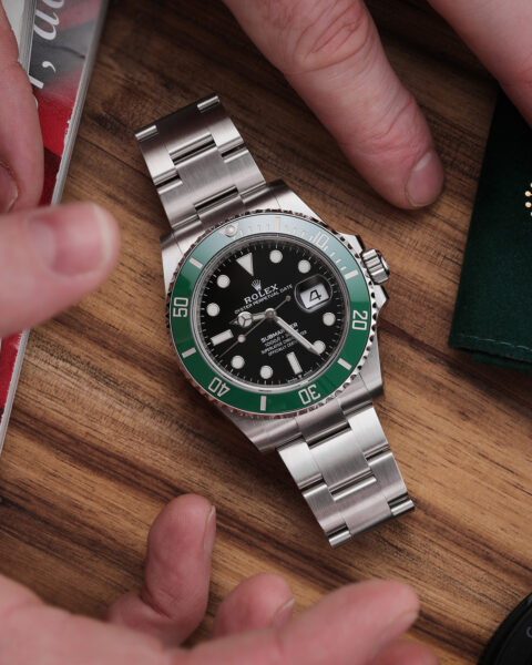The iconic and incredibly collectible Rolex Submariner Starbucks features a green ceramic bezel alongside a contrasting black dial, with white luminescent hour markers, rotating bezel, automatic movement, sapphire crystal set on a stainless steel oyster bracelet. The watch comes with Rolex box, Rolex authenticity card, manuals, booklets and swing tags.