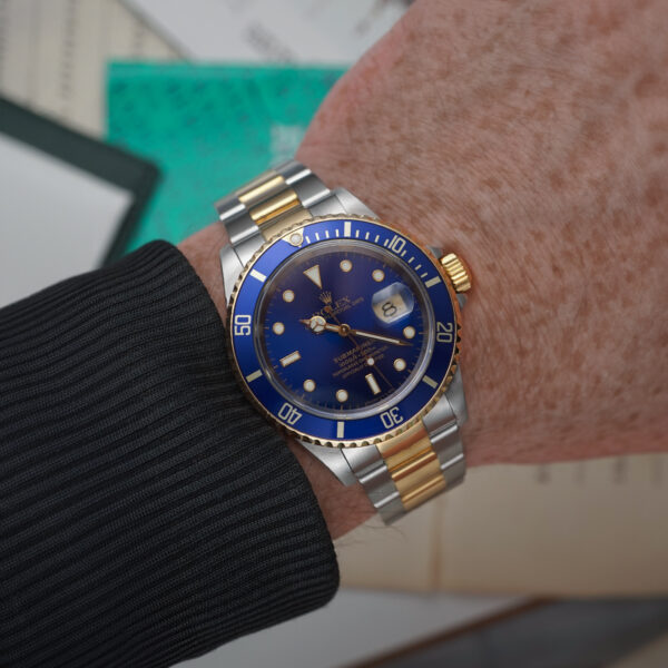 Here’s your chance to own a true Rolex icon — the Submariner Date 16613, a legendary two-tone model that blends rugged functionality with unmistakable luxury. This 1991 example comes as a complete full set, including original Rolex box, papers, and manuals, and is in very good condition throughout.