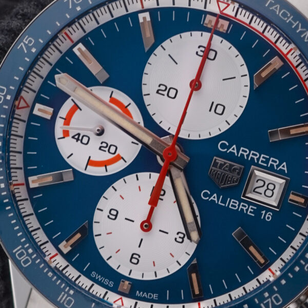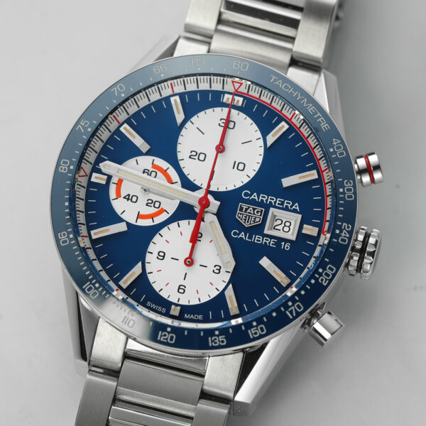This modern Carrera features a 41mm stainless steel case, a striking sunburst blue dial with silver chronograph subdials, and a fixed tachymeter bezel. The date window sits neatly at 3 o’clock, and the sapphire crystal ensures clarity and scratch resistance.